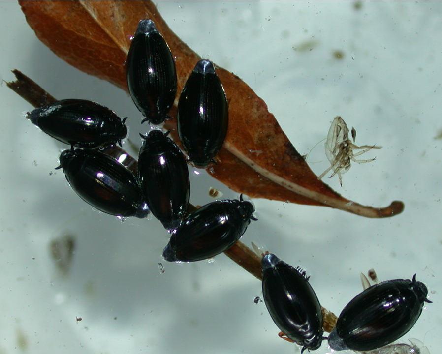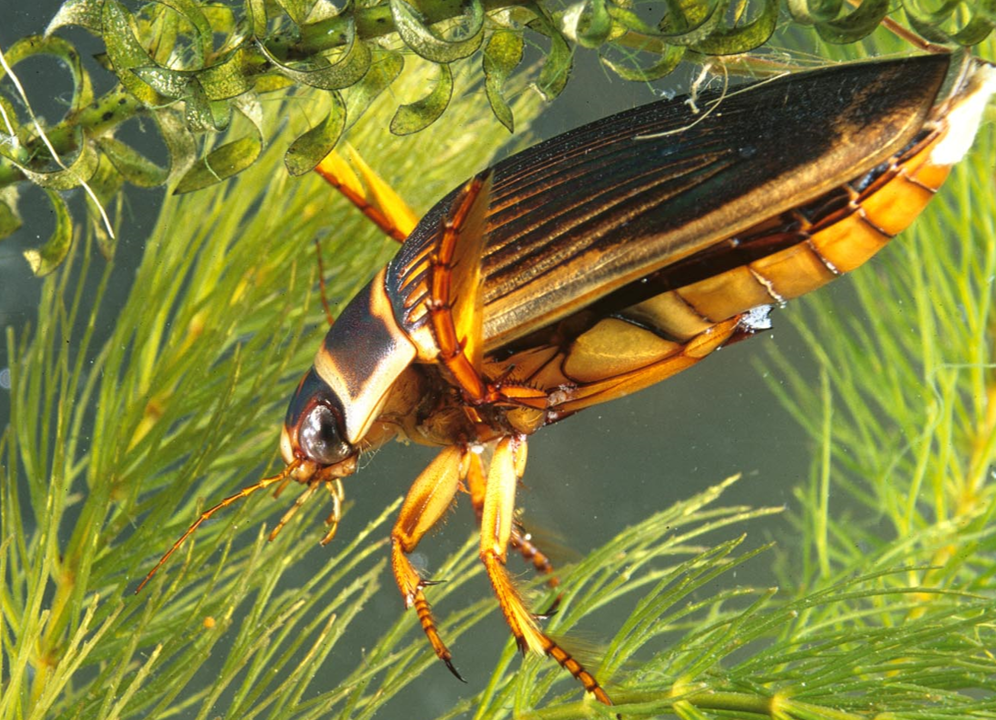 Les Coléoptères aquatiques sont des insectes holométaboles, la larve ne ressemblant pas aux adultes et passant par une métamorphose complète au cours d'un stade sédentaire: la nymphe. Selon les familles, les quatre étapes (phases) du développement (oeuf, larve, nymphe, adulte), d'ordinaire annuel, ne vont pas prendre place dans le même environnement naturel. Les Adephaga, majoritairement prédateurs, élisent domicile dans l'eau aux stades larvaire et adulte, avec presque toujours un intermède terrestre pour la nymphe. La traversée de l'hiver pour l'imago peut aussi se dérouler à terre. Chez les Polyphaga, la situation est bien souvent identique mais laisse place à quelques exceptions importantes. Ainsi les Helophoridae et Hydraenidae ont-ils des larves terrestres et des adultes aquatiques tandis que les Scirtidae adoptent le contraire. Les larves, dotées de pattes, connaissent en général trois stades séparés par des mues, mais les Dryopidae, notamment, en comptent davantage. Le système respiratoire des Coléoptères inféodés aux milieux humides est divers et peut différer d'une phase à l'autre du cycle. Les larves récupèrent l'air au travers de leur tégument ou par l'intermédiaire de stigmates qui communiquent avec le réseau interne trachéen. Plus rarement, l'échange se fait dans des membranes externes (les trachéobranchies) et quelques familles percent les tiges ou racines de plantes aquatiques. Pour leur part, les adultes emmagasinent de l'air sous leurs élytres ou la retiennent sous le corps dans les poils d'un plastron. Le changement morphologique de l'insecte issu de la métamorphose se traduit assez couramment par un bouleversement du régime alimentaire. Le cas est fréquent chez les Hydoptilidae, dont la larve carnivore se transforme en adulte phytophage. La morphologie des adultes a parfois évolué pour s'adapter à la nage. Les prédateurs de grande taille ont ainsi un profil hydrodynamique en ovale allongé avec des pattes également modifiées. Plus petits les Gyrinidae (photo jointe) sont capables de prouesses natatoires à la surface de l'eau, grâce à des pattes en éventail, tandis que leurs yeux divisés séparent physiquement visions aérienne et subaquatique. La silhouette des Adephaga de faible dimension peut avoir l"élégance des plus grands mais le contour ovoïde, se maintient généralement dans l'ovale plus ou moins allongé. Les Polyphaga, à l'exception des espèces de forte stature, n'ont pas à se soucier d'avancer rapidement dans l'eau. Les formes hémisphériques et convexes sont fréquentes tout comme des conformations subparallèles. L'esthétique peut sembler généralement assez terne, mais l'éclat métallique des Hydrochidae et des Donaciidae réserve parfois de belles surprises. |