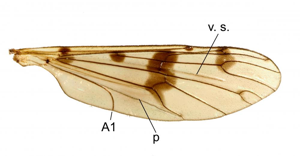- présence d'une seule nervure anale (A1) au lieu de deux nervures anales A1 et A2 chez les Tipulomorpha.