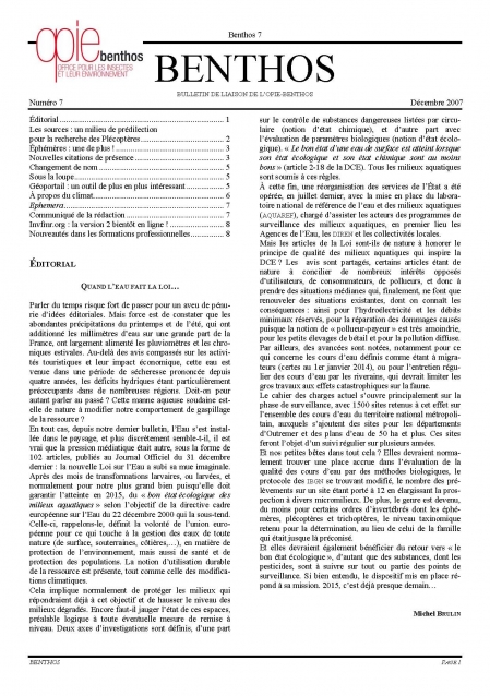 "Benthos" est le bulletin de liaison du groupe Opie-benthos. Il fait le point sur l'avancée des dix inventaires nationaux que nous menons, et traite, entre autres, de sujets très variés concernant les collectes, le matériel, la formation, la bibliographie, etc. Il est ouvert à toutes les participantes et tous les participants qui veulent échanger des observations, des remarques, des tours de main sur l'activité entomologique (récolte de larves ou d'adultes, élevage,...),...Benthos n'a pas de périodicité définie et est diffusé selon l'actualité et le temps disponible à sa confection. À ce jour 15 bulletins ont été réalisés.